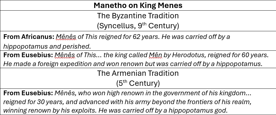 The Armenian tradition is even more explicit and provocative. In this version, also presented as Manetho’s account transmitted through Eusebius, Menes is said to have been killed by a hippopotamus god. While this wording cannot be proven beyond doubt to be either Eusebius’ or Manetho’s original phrasing, the Armenian translation is early and generally conservative, and it often preserves mythic elements that Christian writers had a habit of toning down. Read this way, the Armenian account no longer looks like an odd variant, or a subtle hint, but is a clear transparent echo of the Osiris myth itself: Menes is killed deliberately and not by accident, by the hand of a chaos-aligned villain in an animal guise whose most logical identity is the god Seth.