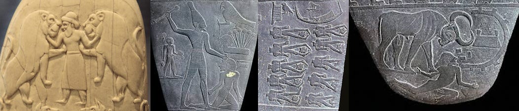 Consider once again the symbols that appear on the Gebel el-Arak knife handle, the Narmer Palette, and the other associated artifacts that pictured the legendary figure.