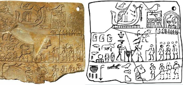 Going back to Kinnaer’s interpretation of the Naqada Label, he offers a footnote to explain what the symbols within the triangle-roofed structure pictured at the top right of the label represent: