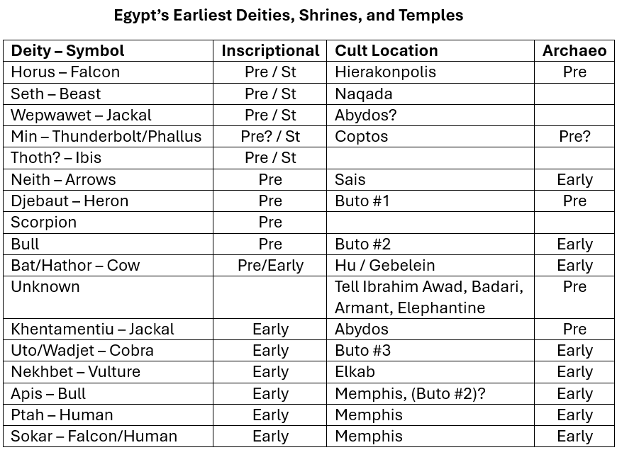 In the table below the most notable early deities are listed, along with all of the known cult locations of the various gods and goddesses that were honored and worshiped into Early Dynastic times. The Inscriptional column notes those deities that appear on standards (St), as well as the time that inscriptional evidence first shows up, whether before Narmer (Pre) or after he established the First Dynasty (Early). The Archaeo column indicates the time (Pre- or Early Dynastic) that archaeological evidence for the first appearance of the god’s associated temple or shrine has been found, if at all.