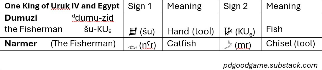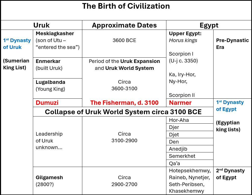 Our claim is that Dumuzi and Narmer are different names for the very same individual, and when this king was murdered around 3100 BCE both the Empire of Uruk and the Kingdom of Egypt collapsed and fell into chaos.
